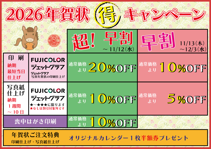 | ★フォトスペース各店にて、年賀状をご注文いただくと★ オリジナルカレンダー1枚半額券(6切・4切・A3サイズのいずれか)プレゼント! ※注意事項 ご利用期限がございます。 オリジナルカレンダー半額券 ご利用期間 引換券お渡し日~令和8年1月31日